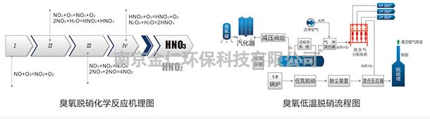 金仁臭氧公司技術研發團隊針對臭氧同時脫硫脫硝過程中 NOX 的氧化機理進行了研究,該機理比較復雜。在實際應用中,可根據低溫條件下臭氧與 NO 的關鍵反應進行研究。低溫條件下,O3 與 NO 之間的關鍵反應如下: